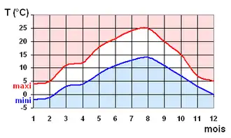 La courbe des températures moyennes, non représentée sur le diagramme, se place entre ces deux courbes extrêmes tracées en rouge et en bleu.