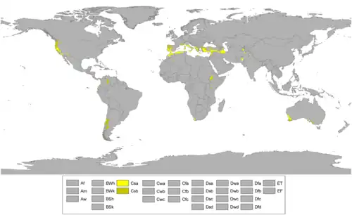 Dans la classification de Köppen, le climat méditerranéen proprement dit est le climat Csa (été chaud) et le climat supra-méditerranéen est le climat Csb (été tempéré). Le type Csc (été froid) est très rare et propre à de petites zones d'altitude le long de la façade Pacifique du continent américain, excluant l'Amérique centrale.