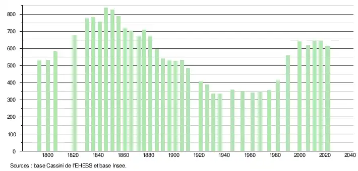 - ↑ Population municipale de référence en vigueur au 1er janvier 2025, millésimée 2022, définie dans les limites territoriales en vigueur au 1er janvier 2024, date de référence statistique : 1er janvier 2022.