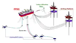 Le pétrole est envoyé sur le FPSO qui le traite, le stocke et le transfère sur des pétroliers enleveurs.