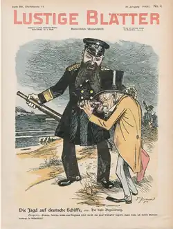 « À la chasse aux vaisseaux allemands » : le chancelier Hohenlohe et l'amiral Alfred von Tirpitz préparant la Marine impériale à une confrontation avec la Royal Navy, caricature de Franz Albert Jüttner pour le magazine allemand Lustige Blätter, 1900.