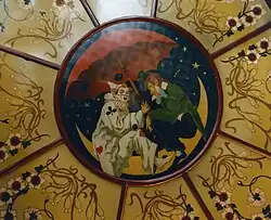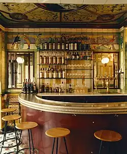 Le décor intérieur est composé d'une frise réalisée par la manufacture de céramique de Sarreguemines et d'un plafond utilisant la technique du fixé sous verre[2]. Il aurait été mis en place dans les années 1920 par l'architecte Jean-Baptiste Mêmery[1], architecte actif à Paris de 1909 à 1945[3].