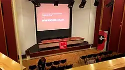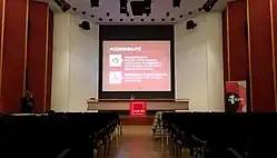 - La salle de conférence, de forme hexagonale, constituée d'un parterre et d'une galerie, partiellement séparée des autres espaces par des rideaux. Elle accueille environ 200 personnes. Une scène surélevée, meublée d'une table, permet aux conférenciers de bénéficier d'une vue d'ensemble sur la salle. La salle possède un équipement sonore complet ainsi qu'un beamer avec écran[3].