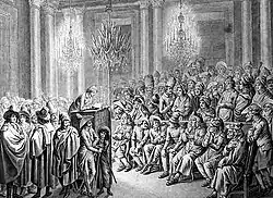 "Ce soir, à 18 heures, une Société des amis allemands de la liberté et de l'égalité de tous les rangs se réunira dans la grande salle de l'académie du château local en prêtant le serment solennel de vivre ou de mourir libres. Le citoyen, le général Cüstine, a promis de glorifier cette scène au nom de la République franconienne par sa présence. L'entrée est gratuite pour tout Allemand pour qui le bonheur de sa patrie et l'humanité qui soupire sur les chaînes des esclaves est un nom sacré. On remarque seulement que personne ne peut être admis qui n'appartient pas à la société ou qui veut y adhérer en prêtant le serment susmentionné. Immédiatement après cette cérémonie, tous les membres signent leur nom sous serment dans le procès-verbal de la Société, qui préparera ensuite la liberté et l'égalité des Mayençais - et peut-être, que Dieu le veuille!