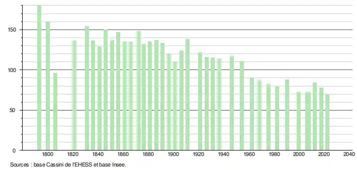L'évolution du nombre d'habitants est connue à travers les recensements de la population effectués dans la commune depuis 1793. Pour les communes de moins de 10 000 habitants, une enquête de recensement portant sur toute la population est réalisée tous les cinq ans, les populations de référence des années intermédiaires étant quant à elles estimées par interpolation ou extrapolation[14]. Pour la commune, le premier recensement exhaustif entrant dans le cadre du nouveau dispositif a été réalisé en 2007[15].