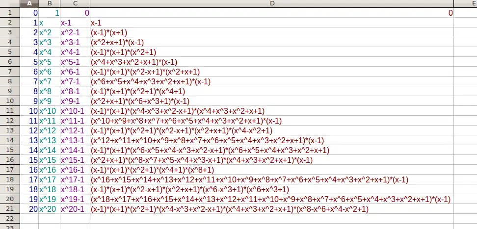 qui, une fois recopiée vers le bas, fait apparaître, sans faire exprès, les polynômes cyclotomiques:
