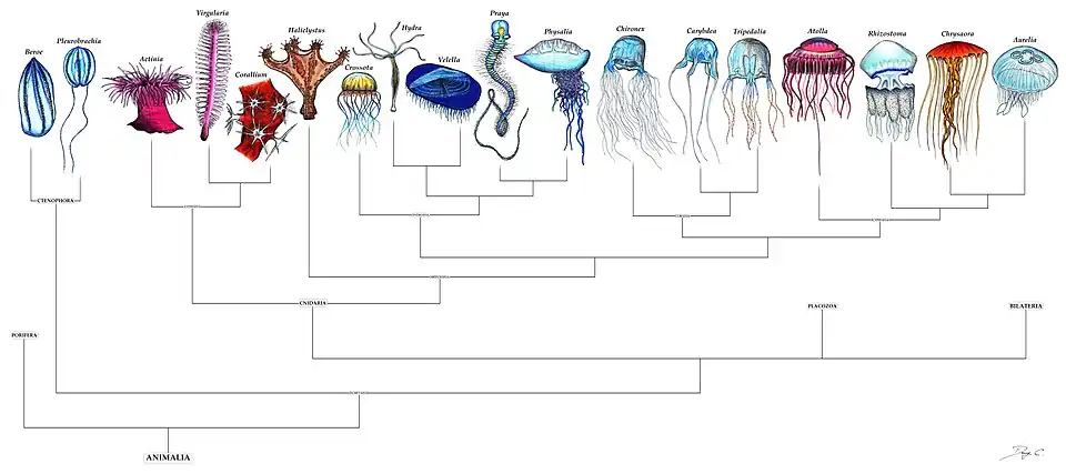 On pense maintenant généralement que les Calcarea (éponges avec des spicules de carbonate de calcium) sont plus étroitement liées aux Cnidaria, Ctenophora et Bilateria (tous les animaux les plus complexes) qu'aux autres groupes d'éponges[17],[18],[19]. En 1866, il a été proposé que Cnidaria et Ctenophora étaient plus étroitement liés les uns aux autres qu'à Bilateria et formaient un groupe appelé Coelenterata (intestin en forme de cavité), car Cnidaria et Ctenophora dépendent tous deux du flux d'eau entrant et sortant d'une seule cavité, pour l'alimentation, l'excrétion et la respiration. En 1881, il a été proposé que Ctenophora et Bilateria étaient plus étroitement liés l'un à l'autre, car ils partageaient des caractéristiques qui manquent à Cnidaria, par exemple les muscles de la couche intermédiaire (mésoglée chez Ctenophora, mésoderme chez Bilateria). Cependant, des analyses plus récentes indiquent que ces similitudes sont plutôt vagues, et l'opinion actuelle, basée sur la phylogénétique moléculaire, est que Cnidaria est plus proche de Bilateria que de Ctenophora. Ce groupement de Cnidaria et de Bilateria a été nommé Planulozoa car il suggère que les premiers Bilatériens étaient apparentables aux larves dites planula des Cnidaires[20],[21].