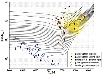 Au début de la mission, deux des quatre dispositifs à transfert de charges sont réservés aux observations astérosismologiques d'étoiles brillantes (de magnitude apparente comprise entre 6 et 9) dans le champ sismo tandis que les deux autres sont dévolus aux étoiles plus faibles, dans le champ exo, pour la détection de transits d'exoplanètes devant leur étoile hôte. En dépit d'un rapport signal sur bruit plus faible, des recherches en physique stellaire sont menées à bien à l'aide des milliers de courbes de lumière recueillies dans le champ exo. Ainsi l'activité stellaire, la rotation, l'évolution des taches stellaires, les interactions planètes/étoile hôte et les systèmes stellaires multiples font l'objet de recherches qui sont venues enrichir encore les objectifs principaux de la mission. Ce champ exo se révèle d'une richesse inattendue en observations astérosismiques également. En six années d'observations, CoRoT observe ainsi environ 150 étoiles brillantes dans le champ sismo et plus de 150 000 étoiles plus faibles dans le champ exo. La figure les situe dans le diagramme de Hertzsprung-Russell avec quelques étoiles supplémentaires observées à partir du sol.