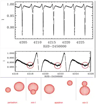 La courbe de lumière de HD 174884. Le panneau supérieur présente la courbe de lumière complète tandis que le panneau central montre un agrandissement dans lequel de tout petits minima secondaires apparaissent (leur profondeur est de 1 % de celle des minima primaires). Le panneau inférieur est une projection sur le plan du ciel (le système tel que nous le voyons) à différentes phases. D'après Carla Maceroni et le groupe des binaires. - HD 174884 : Des pulsations induites par effet de marée sont détectées, dans le système binaire à haute excentricité (e = 0,29) et courte période HD 174884, constitués de deux étoiles de type B[73]. Le panneau supérieur de la figure montre la courbe de lumière complète du système tandis que le panneau central en présente un agrandissement dans lequel apparaissent de minuscules minima secondaires dont la profondeur est d'environ 1 % de celle des minima primaires. En fait, ce système est constitué de deux étoiles de masse, taille et température semblables. Si l'orbite est circulaire, les minima primaires et secondaires ont une profondeur comparable. Le panneau inférieur présente une projection sur le plan du ciel (le système tel que nous le voyons) à différentes phases de l'orbite.
