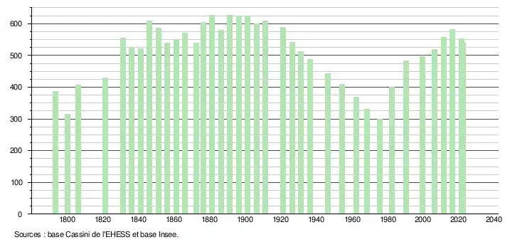 L'évolution du nombre d'habitants est connue à travers les recensements de la population effectués dans la commune depuis 1793. Pour les communes de moins de 10 000 habitants, une enquête de recensement portant sur toute la population est réalisée tous les cinq ans, les populations de référence des années intermédiaires étant quant à elles estimées par interpolation ou extrapolation[27]. Pour la commune, le premier recensement exhaustif entrant dans le cadre du nouveau dispositif a été réalisé en 2006[28].