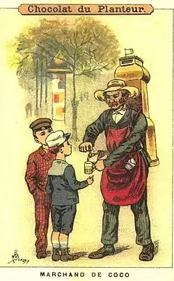 - ↑ Dessin figurant un marchand de coco, extrait du livre Le théatre des ombres chinoises nouveau Séraphin des enfants, recueil de jolies pièces amusantes et faciles à monter., Le Bailly éditeur, Paris 1871.