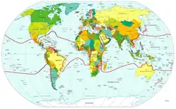 Zone d'habitat du cocotier, délimitée par les lignes rouges (basé sur les travaux de Werth[26]). À noter la présence de cocotiers aux îles Canaries[27], à Madère[28] et sur la côte du KwaZulu-Natal[29], à la suite d'une introduction récente (moins de trente ans).