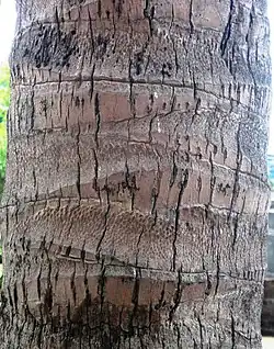 Le stipe s'élargit quelquefois à la base et forme un bulbe qui augmente sa résistance, notamment aux cyclones tropicaux. D'aspect relativement lisse et de couleur claire, le stipe porte des marques régulières : chaque feuille produite par la plante laisse une cicatrice en forme de croissant. L'écart entre ces cicatrices permet de distinguer les deux types de cocotier : les Grands et les Nains. Chez les Grands, l'écart entre deux cicatrices foliaires est supérieur à cm. Chez les Nains, il ne dépasse pas 2,5 cm.