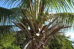 Le cocotier est formé d'un stipe (ou faux-tronc) surmonté d'une large couronne de feuilles. Il mesure jusqu'à 30 m de haut[25]. À l'aisselle de chaque feuille se trouve généralement une inflorescence qui se développe en un régime chargé de noix de coco. Le feuillage du cocotier est persistant.
