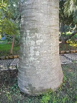 - Le stipe, avec l'âge, se rétrécit sous la couronne, donnant au palmier une forme de bouteille (Le Plantier de Costebelle).