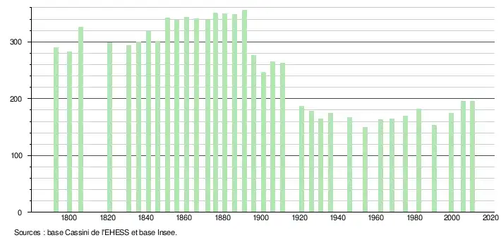 - ↑ Par convention dans Wikipédia, le principe a été retenu de n’afficher dans le tableau des recensements et le graphique, pour les populations légales postérieures à 1999, que les populations correspondant à une enquête exhaustive de recensement pour les communes de moins de 10 000 habitants, et que les populations des années 2006, 2011, 2016, etc. pour les communes de plus de 10 000 habitants, ainsi que la dernière population légale publiée par l’Insee pour l'ensemble des communes.