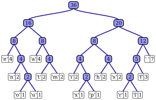Supposons que la phrase à coder est « this is an example of a huffman tree ». On recherche tout d'abord le nombre d'occurrences de chaque caractère. Dans l'exemple précédent, la phrase contient 2 fois le caractère h et 7 espaces. Chaque caractère constitue une des feuilles de l'arbre à laquelle on associe un poids égal à son nombre d'occurrences.