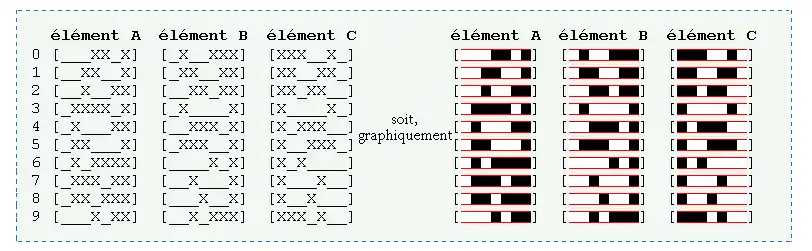 Voici les représentations des 10 chiffres comme éléments A, B ou C :
