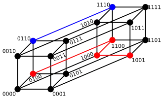 La figure de droite illustre le cas où les lettres de l'alphabet sont binaires et la dimension du code égale à quatre. La distance entre 0110 et 1110 est égale à un car il est nécessaire de parcourir un segment du graphique pour joindre les deux mots. On peut aussi remarquer que les deux mots diffèrent seulement par leur première lettre. La même approche montre que la distance entre 0100 et 1001 est égale à trois.