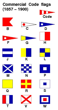Le Code international des signaux a été précédé par une variété de signaux navals et de signaux privés, notamment le Code Marryat, les drapeaux de code les plus largement utilisés avant 1857. L'actuel Code international des signaux a été rédigé en 1855 par la Commission du Commerce britannique et publié en 1857 sous le nom de Code de commerce. Il se composait de deux parties : la première contenant des signaux universels et internationaux et la seconde des signaux britanniques uniquement. Dix-huit indicateurs de signal distincts (voir tableau) ont été utilisés pour créer plus de 70 000 messages possibles. Les voyelles ont été omises de l'ensemble afin d'éviter d'épeler un mot qui pourrait être répréhensible dans n'importe quelle langue, comme certaines lettres peu utilisées. La Commission l'a révisé en 1887 avant d'être modifié à la Conférence internationale de 1889 à Washington, DC[3]. Le nouveau code international des signaux est officiellement entré en vigueur dans le monde entier le 1er janvier 1901. Initialement, le code fut utilisé en même temps que l'ancien système jusqu'au 1er janvier 1902, puis utilisé exclusivement après le 1er janvier 1903. Dans cette nouvelle édition, le nombre de drapeaux passa de 18 et un fanion de code, à 26 et un fanion de code. Les huit nouveaux drapeaux représentaient les voyelles AEIOU et les lettres XYZ[4].