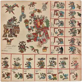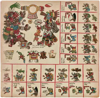 La première partie du codex Borbonicus est formée d'une section de 18 feuillets qui composent de manière incomplète (les deux premières planches étant manquantes) un cycle calendaire de 20 treizaines ou mois de 13 jours (un par page)[25], soit 260 positions journalières appelées Tonalpohualli ("Compte des jours")[26]. Dans sa forme initiale, ce calendrier était consulté par les tonalpouhqui à la manière d'un almanach divinatoire auquel les prêtres nahuas donnaient le nom de Tonalamatl ("Livre des destins")[27].