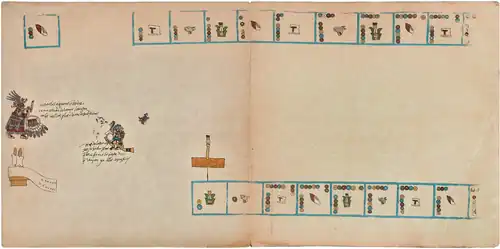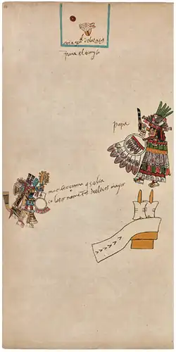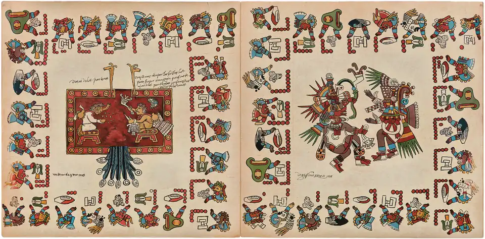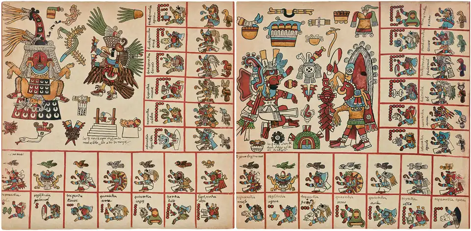 Sur chaque page, de gauche à droite sur la ligne du bas, puis de bas en haut de la colonne de gauche, sont encadrés 13 "Signes journaliers" pris sur une série de 20. Ces glyphes, qui se suivent et se répètent toujours dans le même ordre, sont numérotés avec des points rouges. Ils revêtent tous des caractéristiques prophétiques[28]. Dans ces mêmes cases, chaque "Signe journalier" est accompagné par une figure en buste également évocatrice de présages. Ce sont les "Seigneurs de la nuit" (Yoaltetecuhtin) dont le règne, bénéfique ou maléfique, durait du coucher au lever du soleil[27]. Au nombre de 9, ils se succèdent dans un ordre invariable[note 3]. Aux "Seigneurs de la nuit" et à leurs augures, viennent encore s’adjoindre les 13 "Seigneurs du jour" (Tonaltetecuhtin). Représentés avec des volutes de parole ou de chant dans les cases jouxtant celles des jours, et constamment distribuées en suivant le même comput que celui des treizaines (numérotation de 1 à 13), ces figures divines influençaient à tour de rôle la période journalière allant de minuit à midi. Pour les heures suivantes, accompagnant le déclin du soleil jusqu'à minuit, les "Seigneurs du jour" laissaient leur place à "l'Oiseau précieux" (Iquechol) dont ils étaient affublés[28].