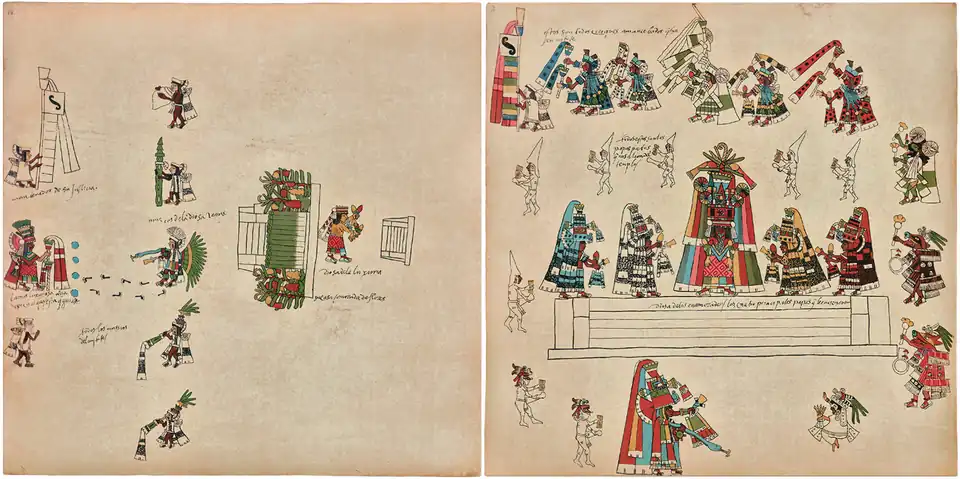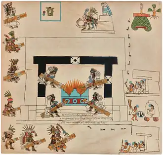 - ↑ En bas à gauche de ces deux pages ont voit une représentation du dieu Xiuhtecuhtli arborant ses attributs typiques, tels que le Xiuhcoatl dans la main, les bâtons à faire le feu dans la coiffe et le pectoral bleu. En face de lui, un prêtre personnifiant la déesse Cihuacoatl, brandissant un sabre de tisserande et tenant son bouclier de plumes d’aigles. Finalement, en dessous de cette dernière figure, on peut voir ce qui a été interprété par Paso y Troncoso comme une maison, sur laquelle ont été plantés des poteaux ornés de papiers, rituel qui caractérisait aussi le mois suivant, Atlcahualo[56].