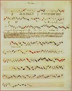 - ↑ Léo Schrade, « La musique au Moyen-âge : De Machaut à Dufay, § Le Motet », dans Roland-Manuel (dir.), Histoire de la musique, t. 1, Paris, Éditions Gallimard, coll. « Encyclopédie de la Pléiade », , 1878 p. (ISBN 2070104044, OCLC 852916, BNF 33042677), p. 880.