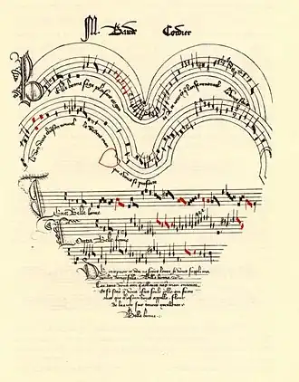 | Jacob de Senleches | no 67 | fo 43v | virelai | La harpe de mellodie[20] | 3 voix (2 écrites plus troisième en canon) | Greene[21] suggère que l'ajout du nom de Senleches est de la main de Baude Cordier, auteur des célèbres pages collées avant le début du corpus, mais selon Upton[22] il n'y a pas de preuve certaine de cette suggestion. Le virelais remarquablement compliqué, est écrit sur une portée à neuf lignes et fut « très admiré par les contemporains ». Voyez le manuscrit de la Newberry Library 54.1, fo 10, reproduit en illustration. |