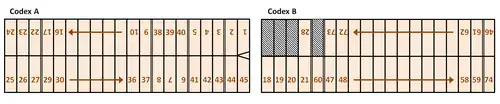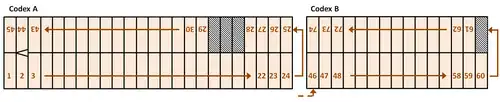 La numérotation des pages a été effectuée par Agostino Aglio, qui fut le premier à transcrire le manuscrit entre 1825 et 1826. Pour ce faire, il a divisé le codex en deux parties, intitulées Codex A et Codex B. Et il a établi la séquence de lecture suivante : Lecture complète du recto du Codex A, suivie de la lecture du verso en sens inverse, c’est-à-dire à partir de la dernière feuille du recto, puis lecture du Codex B dans le même ordre.