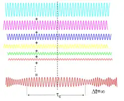 La cohérence temporelle d'une onde est liée à la largeur de bande spectrale de la source. Une onde réellement monochromatique (une seule fréquence) aurait, en théorie, un temps et une longueur de cohérence infinis. En pratique, aucune onde n'est réellement monochromatique (cela impliquerait un train d'ondes de durée infinie), mais, en général, le temps de cohérence de la source est inversement proportionnel à sa largeur de bande . On définit le temps de cohérence de la source par l'inverse de la largeur spectrale . La longueur de cohérence temporelle est où est la vitesse de propagation de l'onde. Si les différents chemins suivis par l'onde diffèrent d'une longueur supérieure à , il n'y aura pas d'interférences : on peut dire, dans ce cas, que la différence de marche est supérieure au train d'onde (ou longueur de cohérence).