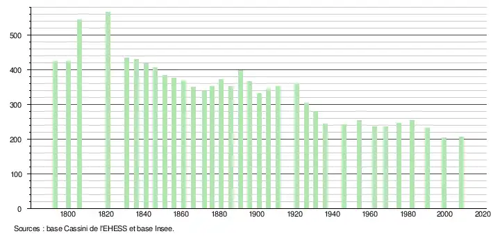 - ↑ Par convention dans Wikipédia, le principe a été retenu de n’afficher dans le tableau des recensements et le graphique, pour les populations légales postérieures à 1999, que les populations correspondant à une enquête exhaustive de recensement pour les communes de moins de 10 000 habitants, et que les populations des années 2006, 2011, 2016, etc. pour les communes de plus de 10 000 habitants, ainsi que la dernière population légale publiée par l’Insee pour l'ensemble des communes.