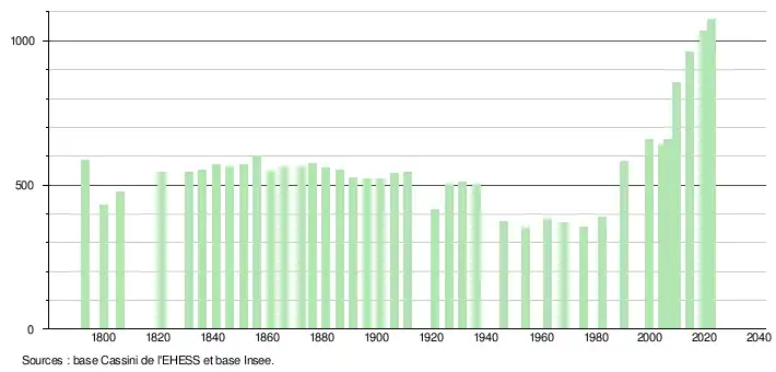 L'évolution du nombre d'habitants est connue à travers les recensements de la population effectués dans la commune depuis 1793. Pour les communes de moins de 10 000 habitants, une enquête de recensement portant sur toute la population est réalisée tous les cinq ans, les populations de référence des années intermédiaires étant quant à elles estimées par interpolation ou extrapolation[28]. Pour la commune, le premier recensement exhaustif entrant dans le cadre du nouveau dispositif a été réalisé en 2004[29].