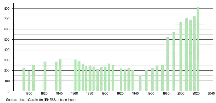 L'évolution du nombre d'habitants est connue à travers les recensements de la population effectués dans la commune depuis 1793. Pour les communes de moins de 10 000 habitants, une enquête de recensement portant sur toute la population est réalisée tous les cinq ans, les populations de référence des années intermédiaires étant quant à elles estimées par interpolation ou extrapolation[19]. Pour la commune, le premier recensement exhaustif entrant dans le cadre du nouveau dispositif a été réalisé en 2007[20].