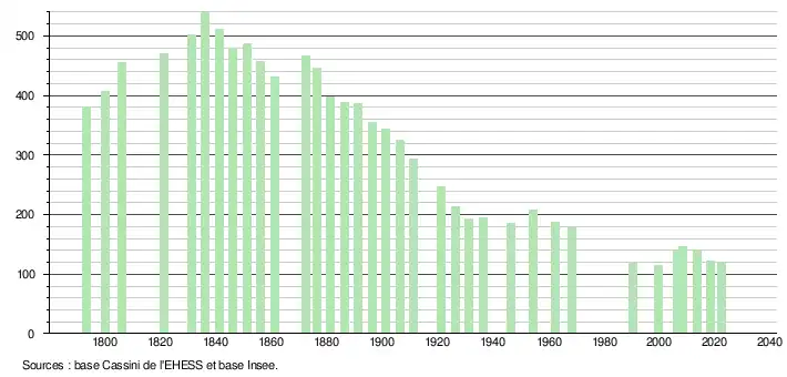 L'évolution du nombre d'habitants est connue à travers les recensements de la population effectués dans la commune depuis 1793. Pour les communes de moins de 10 000 habitants, une enquête de recensement portant sur toute la population est réalisée tous les cinq ans, les populations de référence des années intermédiaires étant quant à elles estimées par interpolation ou extrapolation[17]. Pour la commune, le premier recensement exhaustif entrant dans le cadre du nouveau dispositif a été réalisé en 2008[18].