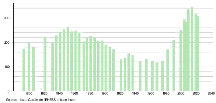 L'évolution du nombre d'habitants est connue à travers les recensements de la population effectués dans la commune depuis 1793. Pour les communes de moins de 10 000 habitants, une enquête de recensement portant sur toute la population est réalisée tous les cinq ans, les populations de référence des années intermédiaires étant quant à elles estimées par interpolation ou extrapolation[23]. Pour la commune, le premier recensement exhaustif entrant dans le cadre du nouveau dispositif a été réalisé en 2004[24].
