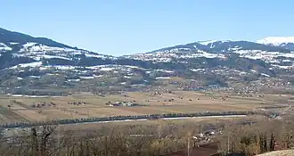 Vue de Megève depuis Rochebrune au sud avec le col de Megève sur la droite, à la sortie du bourg au niveau des bois, et au-delà la vallée de l'Arve. | ||||