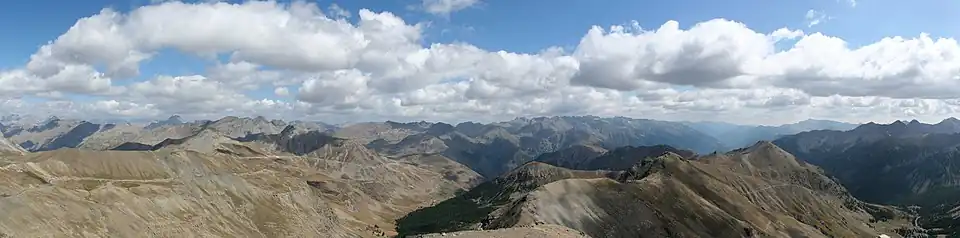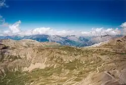 Vue du col et de la cime de la Bonette depuis la route sur le versant de la vallée de l'Ubaye. | |||||