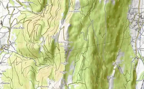 - ↑ Col du Grand Colombier (1 505 m).