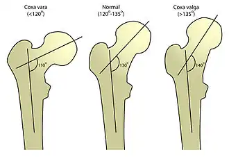 L'ange entre l'axe du col et l'axe du corps du fémur mesure entre 125 et 130°. Cet angle est plus ouvert dans la petite enfance et diminue pendant la croissance.