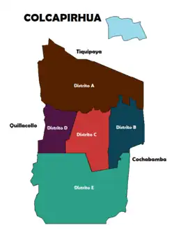 Actuellement, Colcapirhua est constituée de 5 districts, qui couvrent l'ensemble de son territoire[2].
