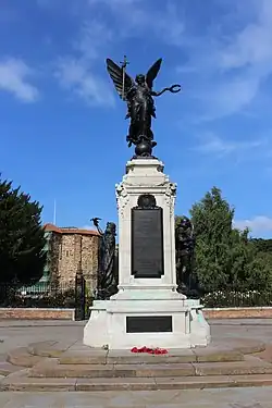 - Le monument aux morts de Colchester, la ville durant la Première Guerre mondiale à perdue 1248 habitants[4]. En 1918, plusieurs associations réclamaient un monument en hommage à leurs sacrifices, le sculpteur Henry Charles Fehr est choisi pour entreprendre la construction du mémorial[5]. Le mémorial se compose de trois figures humaines sur un piédestal. Les figures représentent Saint Georges, une représentation allégorique de la paix et de la déesse grecque Niké.