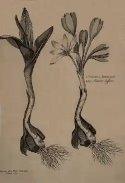 - ↑ Certains botanistes, anciens comme Hippolyte Coste ou contemporains comme Victoria Hammiche, emploient le terme de bulbe (plutôt que de corme), des auteurs du XVIIIe comme Anton von Störck, utilisent le terme de racine (succulente de colchique)