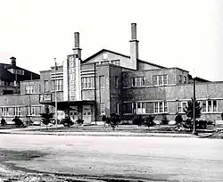 Le colisée (à droite) et la bâtisse industrielle (à gauche).