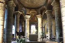 Des fresques romanes ne subsistent que celles du cul-de-four au-dessus du chœur et de la crypte. Au-dessus du chœur, on distingue encore une représentation peu fréquente de l'apocalypse : la Vierge à l'Enfant est représentée dans une mandorle, le Christ est en majesté sur la voûte, entre un cercle et un carré, puis l'Agneau Mystique est représenté dans un cercle. Tout autour, sous des arcatures, les douze apôtres sont représentés assis, comme sur la façade. Les historiens de l'art pensent aujourd'hui que cette peinture a servi de modèle pour les sculptures de la façade, les attitudes et la composition étant identiques. Dans les angles, des anges accompagnent les âmes au paradis. Dans la crypte, les fresques représentent des saints anonymes. Quelques traces de représentations d'animaux apparaissent sous les enduits dans le collatéral nord.