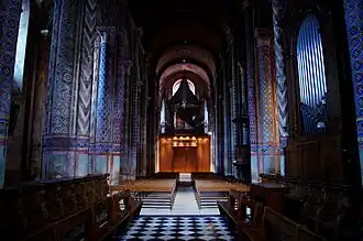 Le décor peint fut restitué sous la direction de Charles Joly-Leterme dans les années 1851-1852 en s'inspirant directement des décors d'origine retrouvés sous les badigeons[2]. Ces peintures furent critiquées par Joris-Karl Huysmans qui parla de « bariolages ». Elles sont, malgré cela, plus proches des habitudes de l'époque romane que les murs bruts sans enduit. Dans les années 1930 les colonnes du chœur furent ainsi décapées selon le goût du XXe siècle pour la sobriété. D'autres peintures néo-romanes et néogothiques ornent les chapelles. C'est d'ailleurs lors de cette campagne de peinture qu'on découvrit les vestiges peints romans. Peintes à l'huile sur enduit, elles se sont très vite dégradées.