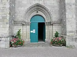 Au centre de la façade occidentale s'ouvre un portail à quatre voussures reposant sur des colonnes engagées, les trois voussures extérieures sont en arc brisé et sont intercalées de décors en dents de scie et roses. Les corbeilles des chapiteaux sont décorées de personnages de style roman. On peut retrouver les mêmes types de personnage sur le portail de l'église de la Trinité-Porhoet[8]. Le portail occidental est surmonté d'une fenêtre à deux lancettes. À l'intérieur du remplage, deux arcatures supportent un cercle. Au-dessus de la fenêtre à deux lancettes, le gable du pignon est orné d'un "écu de Bretagne couché à l'antique et timbré d'un heaume" (Pol de Courcy, "De Rennes à Brest"[5]).