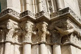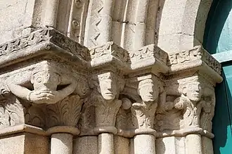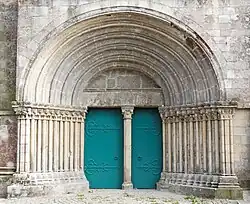 Entre ces chapelles s'insère un portail du XIIe siècle, typiquement roman. Il comporte six voussures en plein cintre sans décoration. Les voussures reposent sur douze colonnettes jumelées à chapiteaux décorés de roses et de feuillages. Les deux chapiteaux les plus externes sont ornés de figurines supportant sur leur dos ou sur leur tête les voussures. La colonne centrale est du XIVe siècle.