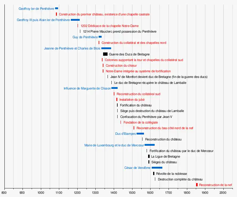 Puis Pierre Mauclerc, duc de Bretagne[5], prend possession du Penthièvre au détriment d'Henri Ier d'Avaugour et on ne retrouve plus de témoignage de travaux à Notre-Dame avant le XIVe siècle.