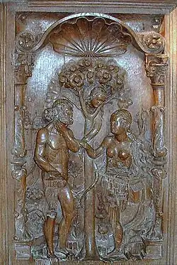On y voit Adam et Ève dans le paradis terrestre, de part et d'autre de l'arbre de la connaissance du bien et du mal. Le démon, à tête humaine, est caché dans l'arbre et semble d'adresser à Ève. Adam porte la main à sa gorge, comme s'il avait déjà mangé le fruit défendu. L'expression de son visage souligne sa prise de conscience tardive. |